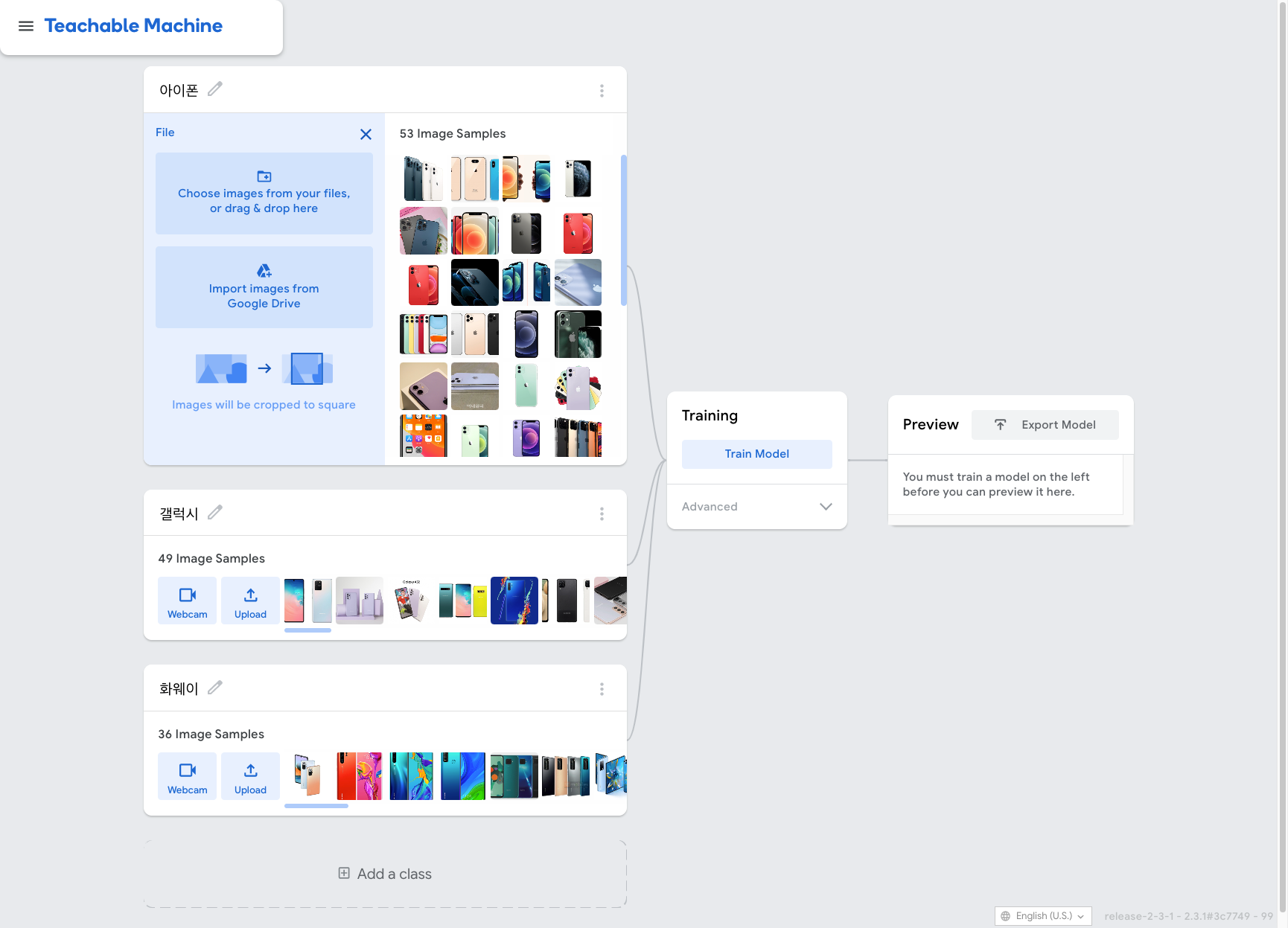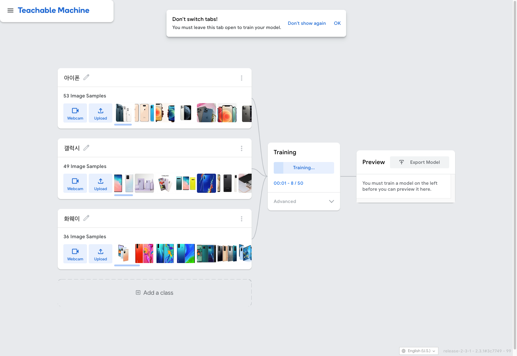 각 항목별로 약 50개의 이미지를 학습시켰다. 이미지를 구글 검색을 통해 찾았으며, 최대한 여러 각도의 사진이나 손으로 들고 있는 사진 그리고 배경과 함께 보이는 사진 등 다양한 각도의 사진으로 선정하였다.