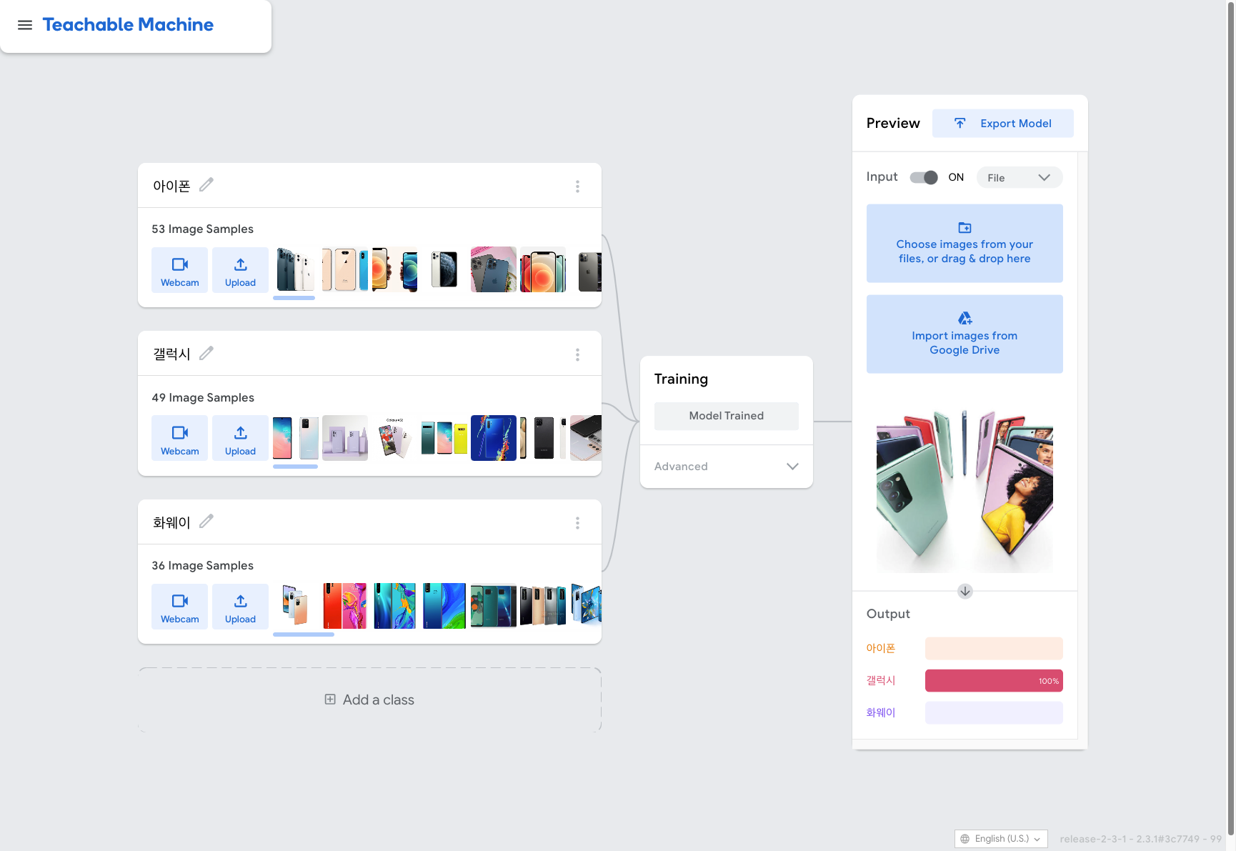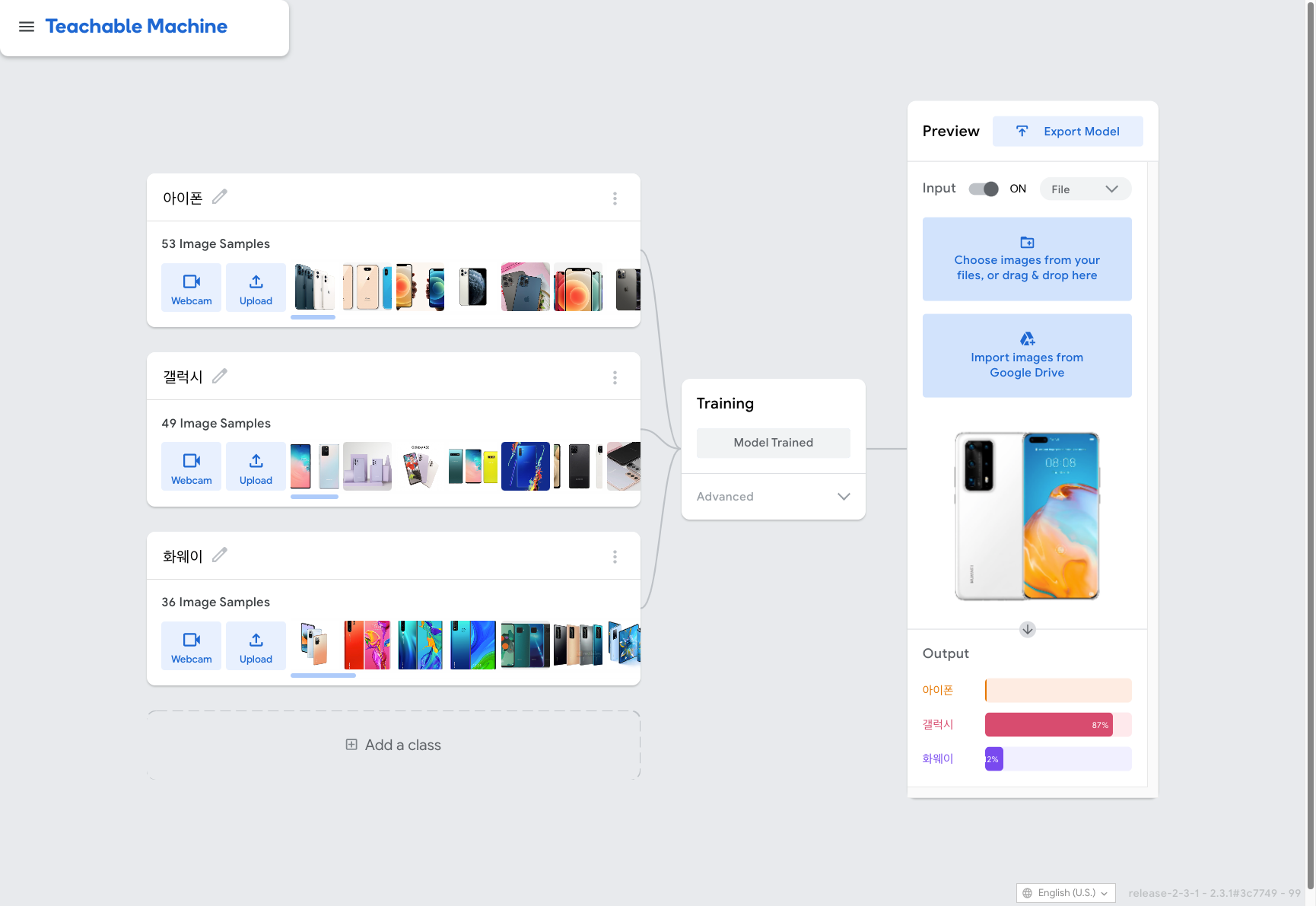 각 항목별로 사진을 업로드할 때 측면 및 손으로 들고 있는 사진 등 다양한 각도의 사진을 학습시킨 결과, 완전 측면인 사진도 잘 인식하였다. 대체적으로 세 회사의 제품이 비슷한 색상과 후면 카메라 부분도 비슷한 구조를 띄고 있어, 구별하기 쉽지 않을 것으로 예상했으나 대체적으로 정확하게 인식을 하고 있었다. 다만 화웨이의 특정 제품의 컬러와 색상이 갤럭시와 유사한 부분이 있었는데, 이 경우 화웨이 폰으로 인식하지 못하고 갤럭시로 인식한 오류가 있었다.