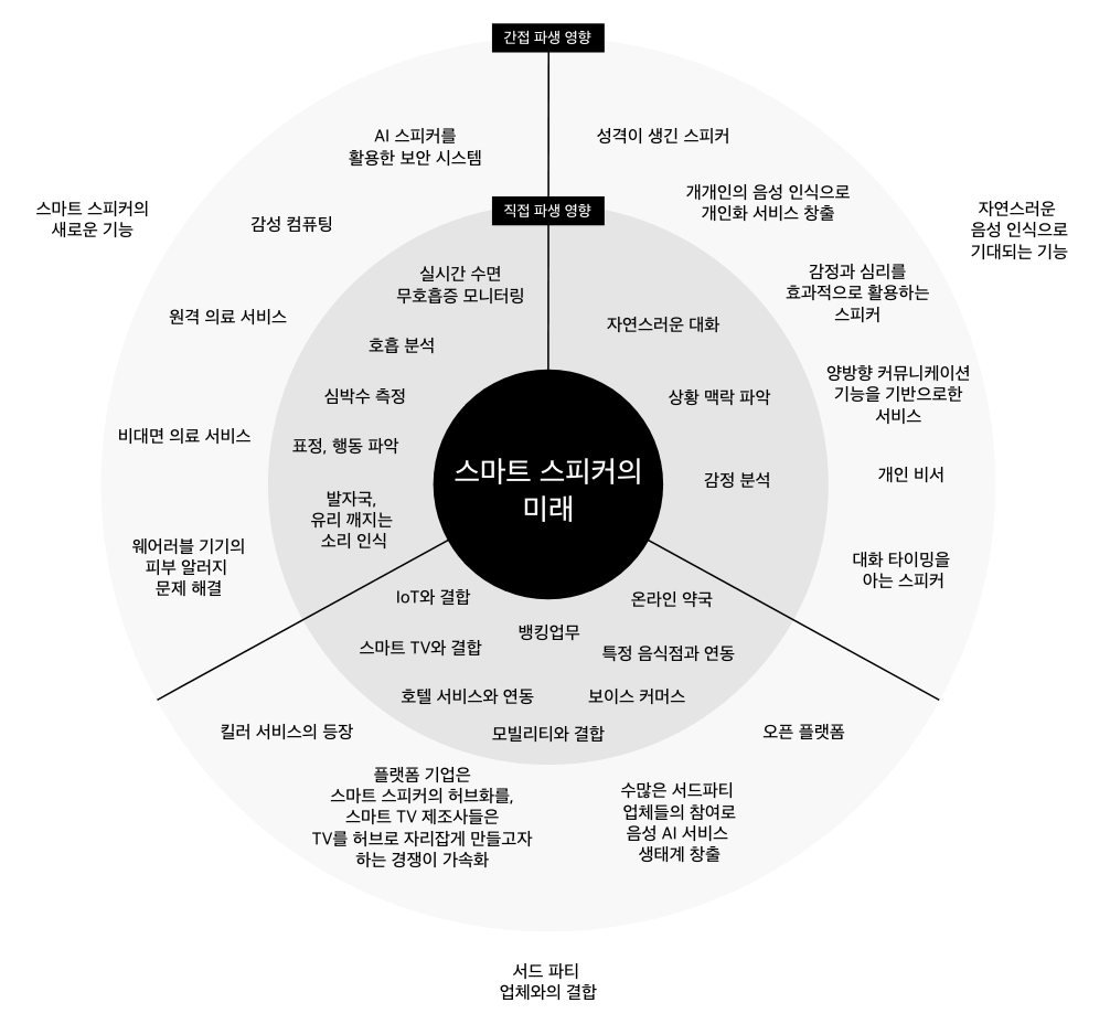 하지만 음성 인식 기술은 지속해서 발전하고 있으며, 터치 인터페이스를 이을 차세대 인터페이스로서의 잠재성이 우수하여서 이 기술을 잘 활용할 방안을 모색하여 대비해야 합니다. 따라서 미래 예측 기법의 하나인 ‘퓨처스 휠’ 기법을 활용하여 현시점에 가장 대중화되어있는 음성 인식 기술인 ‘스마트 스피커의 미래 파급효과’를 예측해보고자 합니다.